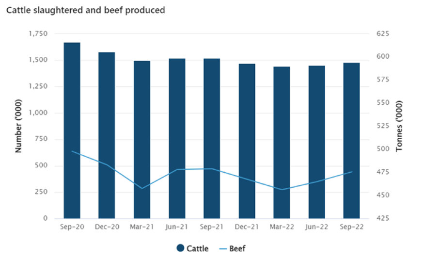 據(jù)報道,與2022年7月相比,澳大利亞在2022年9月當季牛屠宰量增加了1.9%至150萬頭,牛肉產量增長了2.3%至475628噸。在年度比較中,屠宰量同比下降了2.5%,產量同比下降了0.7%。母牛的屠宰率達44%,這表明今年最后一個季度牛群的重建仍在繼續(xù)。另一方面,全國羊屠宰量同比增長了2%,至592萬頭,羊肉產量同比增長7.2%,至14.51萬噸。