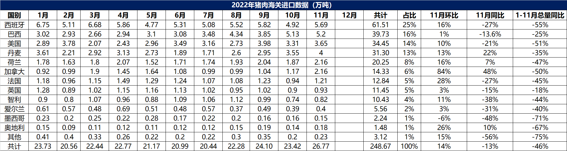 2022年11月中國主港豬肉進(jìn)口量26.77萬噸,環(huán)比增加14%,同比減少13%。1-11月中國主港豬肉進(jìn)口量共計248.67萬噸,同比減少46%。