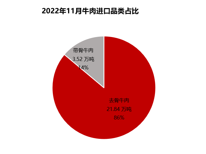 從進(jìn)口品項看,帶骨牛肉進(jìn)口量3.52萬噸,占比14%,去骨牛肉進(jìn)口量21.84萬噸,占比86%。