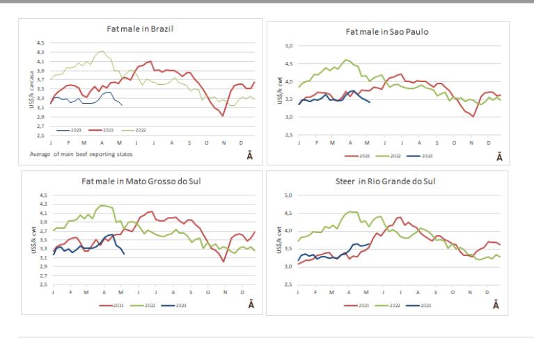 巴西的成品牛價格在過去的五周內持續(xù)下跌。玉米出口州的平均價值為236R$,因此標志著自4月1日以來,每周減少了8R$。主要屠宰場最近幾天均有訂貨,減輕了一些市場的壓力。