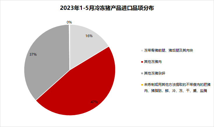 從進口品項看,5月豬肉進口主要品項分別是其他凍豬肉和其他凍豬雜碎,進口量之和占比超過85%。