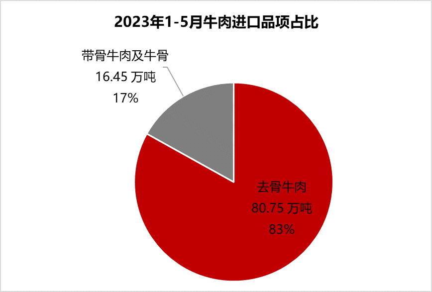 從進口品項看,去骨牛肉進口量80.75萬噸,占比83%,帶骨牛肉及牛骨進口量16.45萬噸,占比17%。