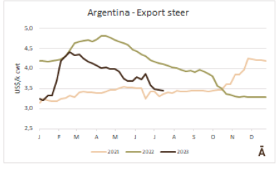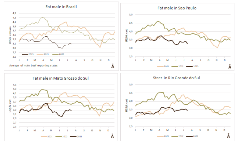 世界牛肉報告顯示過去一周南方共同市場閹牛價格上漲4美分至3.37美元/公斤。牛肉屠宰量增加,烏拉圭上漲了7%,巴拉圭上漲了6%,阿根廷市場保持穩(wěn)定,而巴西出口平均數(shù)減少了1%(-3美分)至每公斤3.08美元。雷亞爾對美元的升值(+1%)阻止了該地區(qū)牛價格的進一步下跌。