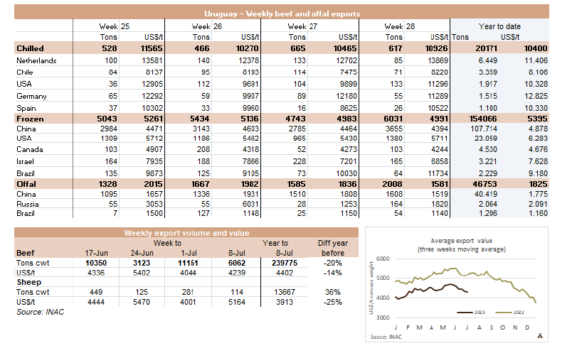 根據(jù)巴西環(huán)境與分析研究所上周發(fā)布的數(shù)據(jù)顯示,由于季節(jié)性調(diào)整,5月份的零售額比4月收縮了1%。與2022年5月相比,零售額也下降了1%,遠(yuǎn)低于分析專家關(guān)于1.6%復(fù)蘇的預(yù)期。預(yù)計7月份出口量將低于16萬噸。上周牛肉出口達到3.925萬噸,周增長5.01%。7月前十個工作日,牛肉出口約7.663萬噸,平均0.766萬噸/天,比2022年7月的日均水平低3.72%。Agrifatto稱:“通常情況下,前兩周的出貨量是最大的,7月迄今為止的統(tǒng)計數(shù)字表明,本月16萬噸的出口預(yù)期很難完成。