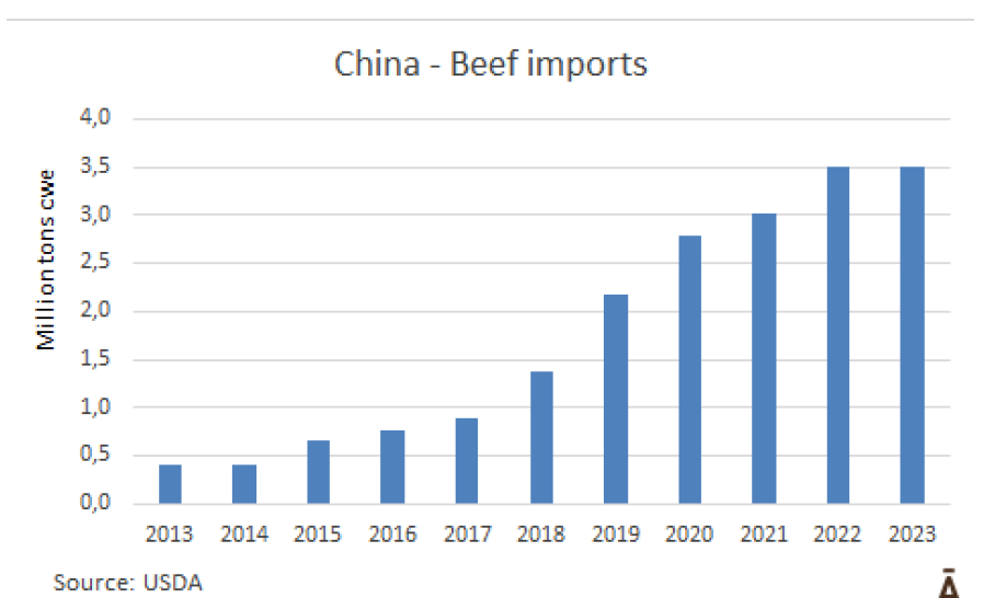盡管中國正在經(jīng)歷經(jīng)濟困難,但美國農(nóng)業(yè)部(USDA)仍將今年牛肉進口預(yù)期維持在350萬噸,與2022年持平。