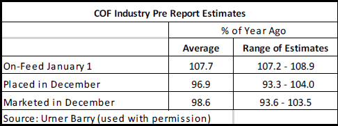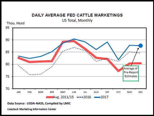 許多分析者預測12月份進入育肥場的育肥牛數(shù)量同比會下降。2016年12月的存欄量是自2010年以來量最大的月份, 最近幾個月的存欄量也一直很大。 然而,如果在報告中會有一個出乎預料的數(shù)據(jù)的話,應該是存欄量會高于報告前預測的平均水平(只有前一年的96.9%)如果12月的存欄量符合報告前預測的平均值,在2017年第四季度(10月-12月)進入育肥場的??倲?shù)同比增幅7.5%(433,000頭),是2012年以來同期最大量。