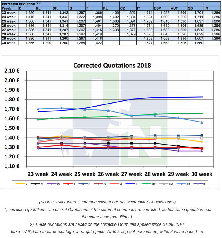 德國(guó)的豬價(jià)也面臨壓力,豬價(jià)下跌3歐分,據(jù)稱是由于假日肉類交易疲軟導(dǎo)致的。德國(guó)屠宰量已經(jīng)低于900,000頭,較去年下降很明顯。歐洲南部地區(qū)豬價(jià)沒有明顯下降,意大利和西班牙假期需求增加。