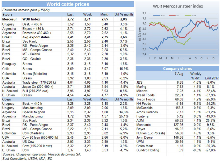 阿根廷閹牛價格再度上漲,自五月初以來阿根廷比索結(jié)算價增加了18%,美金價格也從去年十一月最低的2.43漲到2.74美金,漲幅13%,本周貨幣保持穩(wěn)定,本地牛價上漲使美金價格增加了4美分。烏拉圭牛價穩(wěn)中有升,本周3.52美金,近三年最高。巴西本地牛價有所上漲,但美金價穩(wěn)定在2.41美金,巴拉圭牛價也保持不變。本周南方共同市場閹牛指數(shù)漲了1美分至2.72美金。