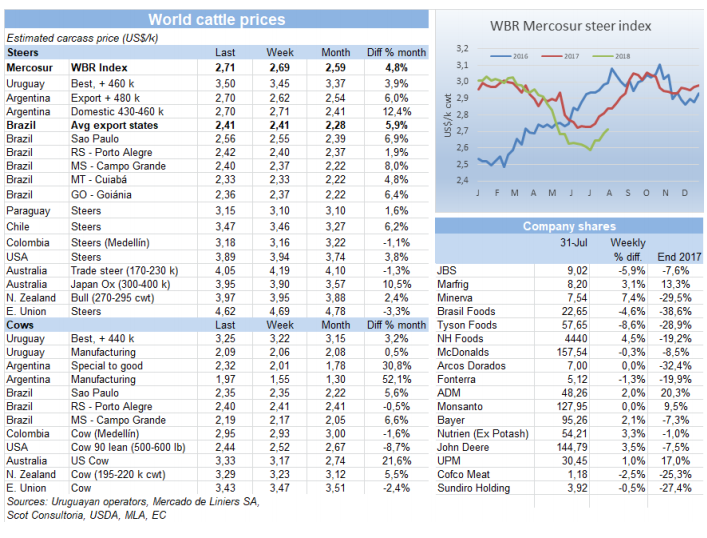 南方共同市場閹牛指數(shù)本周漲了2美分到2.71美金,12周以來最高,本周阿根廷,烏拉圭和巴拉圭牛價都上漲,巴西保持不變。阿根廷近期牛價又開始強勁上漲,本周漲了2比索,換算成美金價漲了8美分至2.7美金,比6月中最低的2.43美金高了很多,巴拉圭和烏拉圭供應(yīng)短缺也促使牛價上漲。巴西本地牛價微漲,但被貨幣的小幅貶值抵消了。