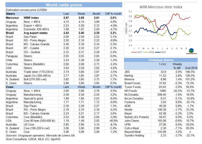 新廠被授權(quán)準(zhǔn)入中國(guó)使南方共同市場(chǎng)對(duì)中國(guó)牛肉出口凈重每月至少增長(zhǎng)4萬(wàn)噸。中國(guó)授權(quán)準(zhǔn)入17家巴西新廠,8家阿根廷新廠,1家烏拉圭新廠,現(xiàn)在主要的局限是冷凍能力。這也是之前為了在未來(lái)幾個(gè)月內(nèi)增加對(duì)中國(guó)產(chǎn)量進(jìn)行投資的原因。預(yù)計(jì)巴西對(duì)中國(guó)出口量將增加一倍,今年每月直接出口到中國(guó)約3萬(wàn)噸,8月增長(zhǎng)至3.7萬(wàn)噸,對(duì)冷凍能力的投資完成后,每月出口將達(dá)到7萬(wàn)噸。其中一部分來(lái)自水漂貨市場(chǎng),另一部分來(lái)自目前輸出的其他目的地,如中東,智利。今年截至目前,阿根廷平均每月對(duì)中國(guó)出口2.9萬(wàn)-3萬(wàn)噸,新工廠被授權(quán)后可達(dá)4萬(wàn)噸,也需要投資改善冷凍條件。烏拉圭工廠屬于中小型,考慮到其持股人是中國(guó)公司,也可以供一些量。2019年前八個(gè)月南方共同市場(chǎng)對(duì)中國(guó)平均每月出口約7.5萬(wàn)噸,冷凍條件的投資一旦完成,加上準(zhǔn)入的新工廠,每月出口量將攀升至11萬(wàn)-12萬(wàn)噸,占出口總量的55%-57%。