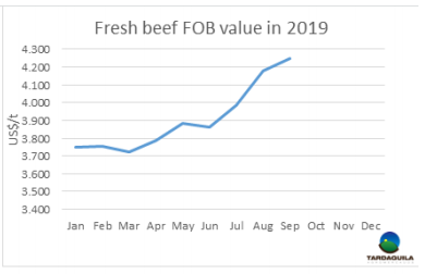 八月牛肉出口總量53293噸(凈出口量),出口額2.905億美元,是2005年以來(lái)最大月出口額。比2018年8月出口量增長(zhǎng)51.2%,出口額增長(zhǎng)64.5%,出口額的增長(zhǎng)比出口量大是由于價(jià)格上漲了8.8%。今年前八個(gè)月,牛肉出口總量為321769噸,比2018年同期增長(zhǎng)45.2%,總出口額17.11億美元,同比增長(zhǎng)40.5%。