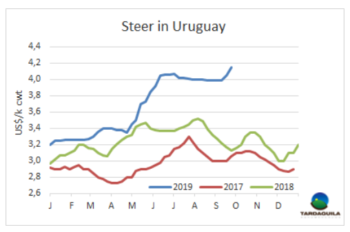 烏拉圭育成牛和后備牛價(jià)格仍反映出供應(yīng)短缺的問(wèn)題,需求端為采購(gòu)施加壓力。工廠繼續(xù)以高價(jià)在國(guó)外市場(chǎng)成交,尤其是中國(guó)。這促使工廠收購(gòu)一切可用的牛。燕麥和苜蓿田的草料產(chǎn)量尚未達(dá)到預(yù)期,因?yàn)槿绿幱诟珊导竟?jié),隨后是降雨和洪水,嚴(yán)峻的霜凍使草料產(chǎn)量下降,直至九月下旬冬季結(jié)束。在沿海地區(qū),今年可供屠宰的牛只增多,在燒掉未達(dá)到預(yù)期產(chǎn)量的燕麥田后,播種夏季作物,主要是大豆。大型加工廠提高報(bào)價(jià)以保證牛只數(shù)量,從昨天開始?xì)W洲市場(chǎng)的481配額的屠宰結(jié)束后,他們現(xiàn)在集中精力完成其他目的地(主要是中國(guó))的出口。最大的問(wèn)題就是牛只很少,小廠被迫效法,但要比大廠投入更多。特種草飼牛胴體價(jià)格4.15美元/公斤,良種母牛3.95美元/公斤,幼母牛4.05美元/公斤,所有參考價(jià)均包含運(yùn)費(fèi),45天內(nèi)付款。本周的大雨將繼續(xù)延遲牛的育肥,一旦供應(yīng)跟上,市場(chǎng)將趨于穩(wěn)定。中國(guó)為一月新年假期的額外需求采購(gòu)結(jié)束后,價(jià)格可能會(huì)下降。