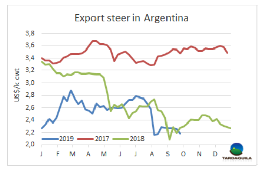 在阿根廷的出口目的地中,中國(guó)不可撼動(dòng)的地位日益突出。2019年1月至8月,中國(guó)采購(gòu)牛肉233757噸,是2018年前八個(gè)月采購(gòu)量的兩倍,占阿根廷牛肉總出口量的72.6%。這一采購(gòu)量是采購(gòu)量排名第二國(guó)家智利的9倍,智利在此期間采購(gòu)量20716噸。以色列和德國(guó)排在3、4位,分別占出口總量的5.4%和5.0%,俄羅斯遠(yuǎn)居其后,占出口總量的2.6%。