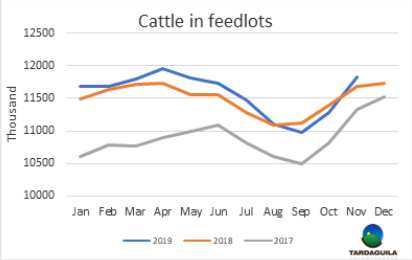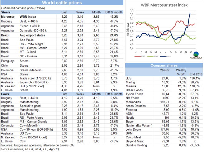 供應(yīng)少量增加,工廠專注2020年歐洲481配額牛肉生產(chǎn),活牛價格出現(xiàn)下行,期貨時間拉長。中國市場的價格下行也對價格有一定影響。特種草飼閹牛胴體價格4.25-4.3美元/公斤,一些工廠出價4.2美元/公斤,目前沒有買到。成年母牛售價4.1美元/公斤,小母牛4.2美元/公斤。市場上昨天成交的期貨14-15天。上周熱浪來襲,巴西南部的一些地區(qū)產(chǎn)生了降水稀少的擔(dān)憂,北部地區(qū)最近有100毫米降水,南部大多數(shù)地區(qū)幾乎沒有降水。近幾周屠宰場將集中481配額牛只的屠宰,草飼牛需求較低,工廠已經(jīng)開始采購配額縮減后的牛只了。預(yù)計(jì)12月中旬市場價格將有下行趨勢。