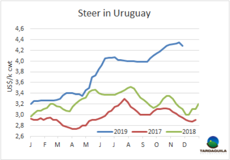 10月閹牛類產(chǎn)品價值1279美元/頭,比上月增長6美元,從7月的1210美元/頭連續(xù)四個月保持上漲趨勢。閹牛類產(chǎn)品價值是指一頭體重480公斤,產(chǎn)出率54%的英國純種閹?;螂s交閹牛產(chǎn)出的所有產(chǎn)品的平均價值的總和。烏拉圭肉協(xié)稱閹牛類產(chǎn)品價值的增長是因?yàn)殚幣2课蝗獬隹趦r值的增長和國內(nèi)市場胴體價格的上漲,部分抵消了牛副和鮮皮價格的下跌。換算成烏拉圭比索,2019年10月閹牛類價值和工廠閹牛采購價格達(dá)到自2008年11月11年以來最高。