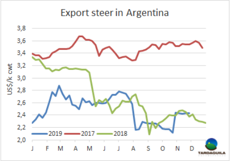 10月阿根廷牛肉出口胴體重量達(dá)96488噸,比上月增長20%,與去年同比增長60%。出口產(chǎn)品凈重65385噸,其中出口至中國5萬噸,出口額3.64億美元。這一出口量打破了2005年創(chuàng)下的最新紀(jì)錄,歷史上達(dá)到這一出口額則要追溯到1967年歐洲市場暫停進(jìn)口帶骨肉類的時候。2019年總出口量將達(dá)到80萬噸,達(dá)到50多年來至今最大量。