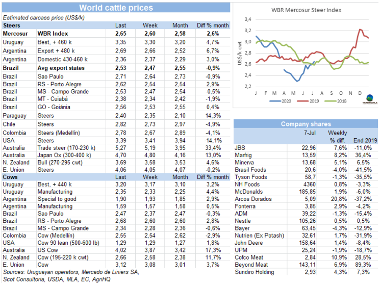 一位貿(mào)易商總結(jié),“現(xiàn)在市場(chǎng)有所好轉(zhuǎn)”。部分原因是中國(guó)市場(chǎng)開始回暖,尤其是一些部位肉的價(jià)格有所上漲,盡管他強(qiáng)調(diào)仍存在一些投機(jī)的貿(mào)易。未來我們將看到價(jià)格是否可以保持,是上漲一些還是回到一周之前的水平。中國(guó)市場(chǎng)很亂,有客戶考慮到目前的狀況仍想出低價(jià),而另一些人認(rèn)為后面幾個(gè)月會(huì)漲價(jià)已經(jīng)以高一些的價(jià)格確認(rèn)。牛肉價(jià)格上漲受到豬價(jià)上漲的拉動(dòng),其他肉類也是如此。中國(guó)白條價(jià)格連續(xù)7周上漲至3.4美元/公斤,較五月下旬低點(diǎn)上漲了35%。一位貿(mào)易商強(qiáng)調(diào),烏拉圭對(duì)疫情的控制相對(duì)較好,對(duì)進(jìn)口商來講比較穩(wěn)定,與阿根廷和巴西正在經(jīng)歷的情況大相徑庭,對(duì)于要提前付預(yù)付的進(jìn)口商來說非常重要。阿根廷統(tǒng)牛六切報(bào)價(jià)范圍在3950-4100較上周上漲了200-300美元/噸。巴西工廠也表示中國(guó)市場(chǎng)有所好轉(zhuǎn),香港漂貨市場(chǎng)前后腱成交價(jià)4000美元/噸,從上周開始出口市場(chǎng)更活躍了。一位出口商強(qiáng)調(diào),收到的牛副還價(jià)很低,都是一些不可能成交的價(jià)格。