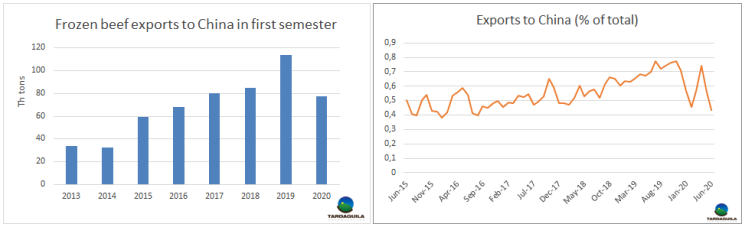 上一季度冰鮮牛肉出口量較冷凍牛肉出口量下降幅度更大,歐洲、巴西、智利等冰鮮牛肉的傳統(tǒng)市場(chǎng)受新冠疫情影響,需求大幅下降。4-6月,烏拉圭冰鮮牛肉出口量6053噸,同比減少36%,冷凍牛肉出口量64420噸,同比減少18%。烏拉圭出口商正在尋找其他替代市場(chǎng)。在過去的一個(gè)季度,到北美和亞洲的出口量顯著增加。出口至北美市場(chǎng)898噸,是2019年同期338噸的兩倍多。到亞洲出口量增加了近150%,達(dá)814噸,其中出口至日本566噸,出口至中國(guó)248噸。過去兩個(gè)月,冰鮮牛肉到中國(guó)出口量已經(jīng)從很少增長(zhǎng)至每月5柜。本季度出口到中國(guó)的冰鮮牛肉平均價(jià)格5685美元/噸,而冷凍牛肉平均價(jià)格為4561美元/噸。