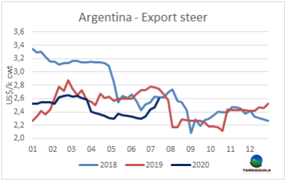 巴西屠宰活動(dòng)穩(wěn)定,阿根廷成為南方共同市場閹牛平均價(jià)格上漲的主要推手。本周南方共同市場閹牛價(jià)格指數(shù)上漲4美分,上漲至2.69美元/公斤。隨著歐洲冰鮮牛肉產(chǎn)品價(jià)格上漲,本周阿根廷閹牛出口價(jià)格上漲10比索/公斤,美元價(jià)格,加上9%的出口稅,達(dá)2.83美元/公斤,一周內(nèi)上漲14美分。烏拉圭牛價(jià)上漲5美分/公斤,上漲至3.4美元/公斤。巴西和巴拉圭活牛參考價(jià)保持穩(wěn)定,分別為2.53美元/公斤和2.4美元/公斤。