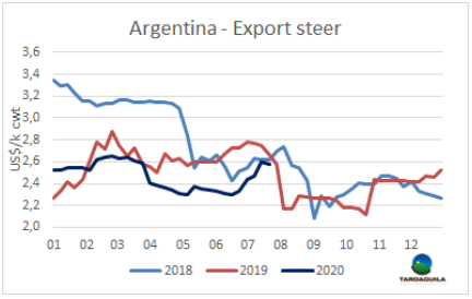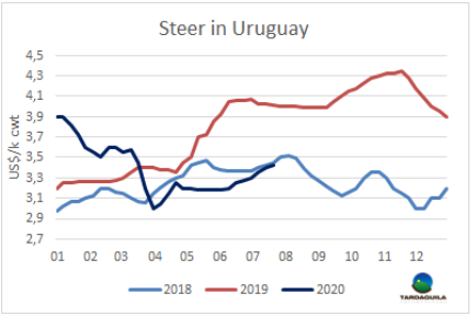 歐盟昨日宣布的大規(guī)模經(jīng)濟刺激計劃,以及新冠肺炎疫苗研制進展的利好消息,帶動了市場的樂觀情緒,推高了主要股指,新興國家貨幣也有升值。昨天巴西雷亞爾增值2.4%,較一周前增值3%,促進牛價堅挺。巴西主要出口州育成牛雷亞爾平均價格上漲了0.7%,美元價格上漲0.9美分,上漲至2.62美元/公斤。巴拉圭和烏拉圭牛價保持冬季一直以來的上行趨勢。巴拉圭閹牛報價2.45美元/噸,烏拉圭牛價要高出1美元,3.43美元/噸。阿根廷出口閹牛比索價格與上周保持不變,由于比索官方匯率珠江下跌,美元價格下跌2美分至2.81美元/公斤。南方共同市場活牛價格指數(shù)本周上漲5美分,上漲至2.74美元/公斤。