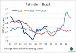 受巴拉圭和烏拉圭牛價下跌以及巴西雷亞爾匯率疲軟的影響,本周南方共同市場閹牛價格指數(shù)下跌1美分,下跌至2.75美元/公斤。巴西方面在基準利率Selic再次下調(diào)至2%的歷史新低后,美元在一周內(nèi)上漲了2%。此外有跡象表明,牛價還將進一步下跌。雷亞爾的疲軟掩蓋了以當?shù)刎泿庞嬎愕挠膳r格上漲,最后,以美元計的價格仍保持在2.64美元/噸不變。烏拉圭方面牛價保持急劇下跌的趨勢,出口閹牛成交價最高3.4美元/公斤,較上周下跌3美分。南美地區(qū)唯一一個育成牛價格上漲的國家是阿根廷,上漲了3美分,出口閹牛價格上漲至2.87美元/公斤,包含出口稅。