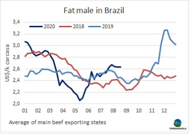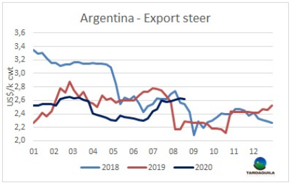 盡管今年這個時候草飼牛的供應接近為零,需求端仍集中精力在為481配額生產(chǎn),對其他類型的牛興趣極低。因此參考價再次下調(diào),預定期限拉長,大多數(shù)是九月第二周,配額生產(chǎn)快要完成的時候。有一些工廠不還價,另一些還價水平在閹牛3.3美元/公斤,母牛3.1美元/公斤,一些成交價比該參考價高一些,閹牛成交在3.35美元/公斤,母牛成交在3.15-3.2美元/公斤。今年疫情最嚴重的時候出現(xiàn)了特殊的情況,人們對體重輕的閹牛和國內(nèi)市場小母牛更感興趣,它們的價格與體重較重的牛相當,甚至略高,預定時間也可能更短。烏拉圭多個地區(qū),特別是北部地區(qū),人們對降水狀況越來越擔心,北部地區(qū)幾個月來沒有明顯的降雨記錄。預計從今天到周五還會有一股寒潮,伴有嚴重霜凍,甚至可能出現(xiàn)降雪。預計牛價的下行壓力將至少持續(xù)到9月初。工廠已經(jīng)訂購了配額開始完成的牛,因此,至少到那時候,預計不會出現(xiàn)根本的變化。