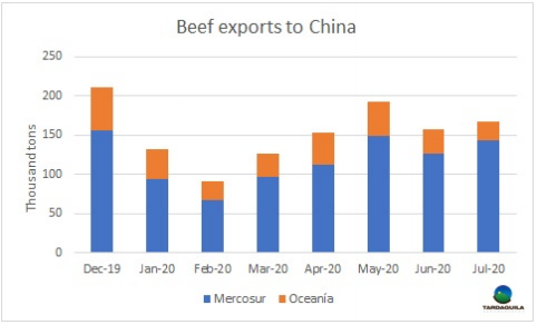 截止今年7月,南方共同市場的牛肉消費量下降了42萬噸,部分原因是產(chǎn)量下降,加上出口競爭力較疲軟的國內(nèi)市場有所提高。巴西、巴拉圭和烏拉圭牛肉消費量顯著下降,阿根廷牛肉消費量相對穩(wěn)定。相對權重最大的市場是巴西,雷亞爾貶值使出口競爭力提高,新冠疫情危機對巴西購買力的也產(chǎn)生影響,與2019年前7個月相比,國內(nèi)消費下降了40多萬噸。按百分比計算,消費下降更劇烈的是烏拉圭,產(chǎn)量的急劇下降被進口的增加部分抵消。預計這一趨勢將在未來幾個月持續(xù)下去,因為國內(nèi)需求沒有改善跡象,而這可能開始改變目前部分出口量的去向。