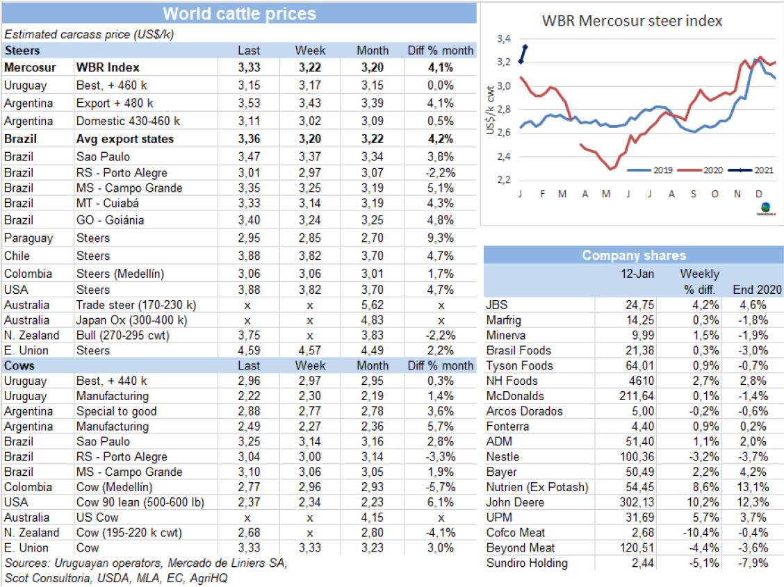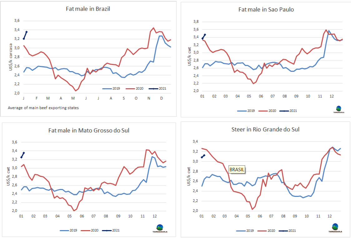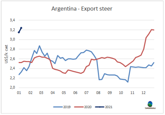 育成牛價(jià)格連續(xù)11周累計(jì)上漲了31%之后,在年初價(jià)格小幅下跌,預(yù)計(jì)出口活牛價(jià)格將繼續(xù)下跌。一方面由于出口稅的原因,1月份通常比在12月份更方便生產(chǎn)商銷售,另一方面國內(nèi)需求受隔離影響減弱和一些國際市場尤其是歐洲市場的困難。然而,在沒有明確的理由支持這種復(fù)蘇的情況下,牛價(jià)又恢復(fù)了上漲的趨勢。最好的英國純種閹牛價(jià)格下上漲了10比索,至270-280比索/公斤,串種閹牛價(jià)格上漲了10-15比索至265-275比索/公斤,特優(yōu)母牛價(jià)格保持232-242比索/公斤,主要出口至中國的工業(yè)母牛價(jià)格上漲了2-4美分,215-218比索/公斤。