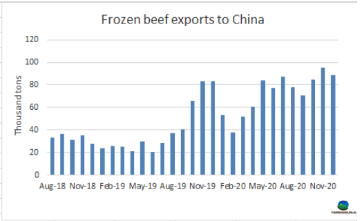 2020年第四季度烏拉圭牛肉進(jìn)口量下降了28%