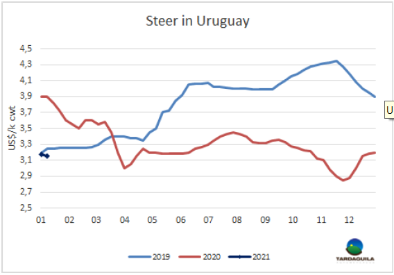 育肥牛市場參考價(jià)保持與上周相近,但成交緩慢,預(yù)定時(shí)間拉長。工廠接受報(bào)盤,但不會主動詢盤,預(yù)訂時(shí)間各不相同,但都不少于12-13天。有些工廠甚至預(yù)定了接貨日期在2月第一周的牛。特種閹牛參考價(jià)3.15美元/公斤,有些工廠報(bào)價(jià)3.1美元/公斤有零星成交,一些成交價(jià)達(dá)到3.2美元/公斤。重型母牛普遍價(jià)格在2.95-2.97美元/公斤;小母牛供應(yīng)充足,一年中這一時(shí)期采購需求很差,成交價(jià)在3-3.05美元/公斤。由于沒有481配額窗口,并且烏拉圭居民受到旅行限制,需求端很難接受這類產(chǎn)品的供應(yīng)。最近烏拉圭一些地區(qū)降水很大,這無疑會讓供應(yīng)端更平靜。天氣預(yù)報(bào)顯示,周末天氣還將更加惡劣。昨日咨詢的兩位市場參與者一致認(rèn)為,由于采購端興趣較低,似似乎不存在價(jià)格復(fù)蘇的有利條件。預(yù)計(jì)未來幾天市場將趨于平衡。