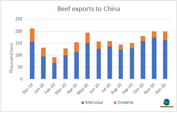 根據(jù)主要出口國的出口數(shù)據(jù)和阿根廷的預(yù)估出口數(shù)據(jù),12月全球兩大主要供應(yīng)商南美和澳洲對中國出口量保持20萬噸,與11月水平相當(dāng)。11月和12月出口數(shù)據(jù)的差異在于澳洲的出口量占比增大,尤其是來自新西蘭的出口量,新西蘭出口量約2萬噸,達(dá)2019年12月以來最大。新西蘭的出口量增加是由于船期變短了。因?yàn)檫@些產(chǎn)品需在春節(jié)前到港。目前,南美目前的大部分12月裝船的產(chǎn)品很難趕上春節(jié)到港。南美對中國出口量約達(dá)16.3萬噸,較11月減少了1萬噸。12月澳洲對中國牛肉出口量3.5萬噸,較11月增長了9%。12月這兩個地區(qū)的出口量較2019年12月下降了12%,盡管南美地區(qū)對中國出口量增長了7%,也沒能抵消澳洲對中國出口量同比2萬噸的下降。