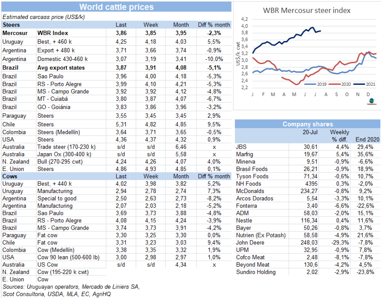 南方共同市場閹牛價格指數(shù)連續(xù)第二周上漲,本周上漲了1美分至3.86美元/公斤。烏拉圭、阿根廷和巴拉圭牛價上漲,巴西牛價由于匯率疲軟下跌。由于雷亞爾貶值0.9%,巴西主要出口州育肥牛價格下跌了4美分至3.87美元/公斤,烏拉圭牛價繼續(xù)領跑其他國家,特種閹牛價格4.25美元/公斤,巴拉圭牛價也很堅挺,本周上漲了101美分至3.55美元/公斤。阿根廷最好的英國純種閹牛價格上漲了5美分至3.71美元/公斤。