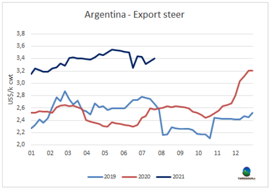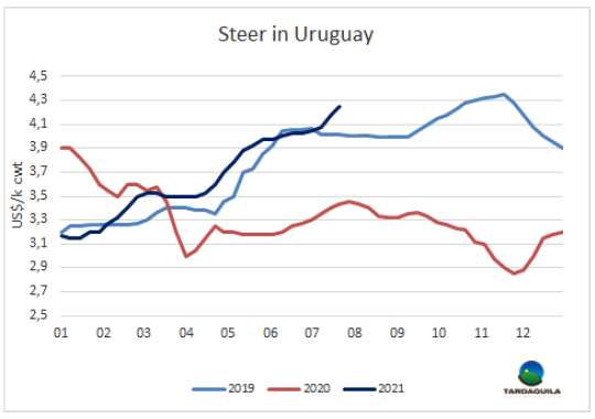 6月閹牛類型價值1261美元/頭,較上月增長了65美元,達2020年1月至今17個月以來的最高。烏拉圭肉協(xié)報告稱本月閹牛類型價值增加的原因是出口部位肉價格上漲和國內(nèi)市場胴體價格、副產(chǎn)品和鮮皮價格上漲。活牛采購價格上漲了37美元/頭,因此兩者的價差工業(yè)增加值增長了29美元至214美元,工業(yè)增加值增長了1.5%至17%,如果價值低于20%,則認為該行業(yè)很難實現(xiàn)正利潤。