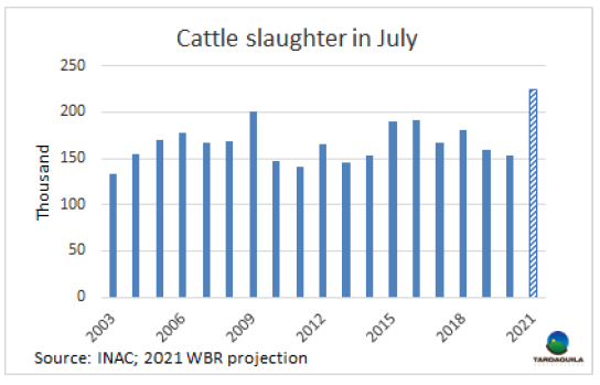 7月前17天,烏拉圭屠宰行業(yè)牛屠宰量達127297頭,較2020年同期增長了4萬頭(46%),據(jù)本月結(jié)束還剩兩周,預計2021年七月牛屠宰量將達歷年七月最高。截至目前只有兩各年度期月屠宰量超過20萬頭,1982年(歷史上最糟糕的一次經(jīng)濟危機,以所謂的“匯率制度”的崩潰而告終)和1989年,當時烏拉圭經(jīng)歷了嚴重的干旱,這兩年的屠宰量分別達到了20.1萬頭和20.3萬頭。今年如果接下來兩周的周屠宰量保持5萬頭以上,七月屠宰量將達22.5萬頭,將輕松超過以往的屠宰量記錄。記者問詢的工廠都一致認為接下來兩周屠宰量將保持當前節(jié)奏,一些工廠已經(jīng)備足了待宰牛,因此大概率七月屠宰量記錄將會打破。上周,盡管冬季來臨,據(jù)烏拉圭肉協(xié)報告統(tǒng)計,上周牛屠宰量51754頭,較前一周增長了550頭,屠宰量連續(xù)第四周保持五萬頭以上,較去年同期增長了2萬頭以上,(+66%)。本周閹牛屠宰量繼續(xù)減少,母牛屠宰量增長。閹牛屠宰量較上周減少了9%至21398頭,母牛屠宰量增長了9%至22868頭,母牛屠宰量較去年同期有突出的增長。屠宰量最大的工廠是Las Piedras(4475頭),Athena-pulsa(4384頭),Carrasco(4079頭)。Marfrig四家工廠屠宰總量14019頭,較上周下降了700頭, 從這周起,Colonia廠所有員工開始休假,因此接下來四周Marfrig僅有三家工廠進行屠宰活動。Athena工廠屠宰下降了約400頭至12402頭。