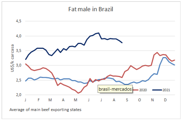 由于市場堅挺,活牛供應(yīng)增加,巴西肉品加工廠本周初對育肥牛價格下行施加了壓力。本周一圣保羅幾乎沒有交易。育肥公牛和肉母牛價格保持穩(wěn)定,小母牛價格下降了2雷亞爾/15公斤,圣保羅州育肥牛參考價315雷亞爾/15公斤,育肥母牛292雷亞爾/15公斤,小母牛308雷亞爾/15公斤,30天付款。巴西前兩周出口保持良好節(jié)奏,飼育場供應(yīng)充足。同時,預(yù)計本周工廠待宰牛需求將增加,以滿足國內(nèi)市場月初幾天銷量的增加。
