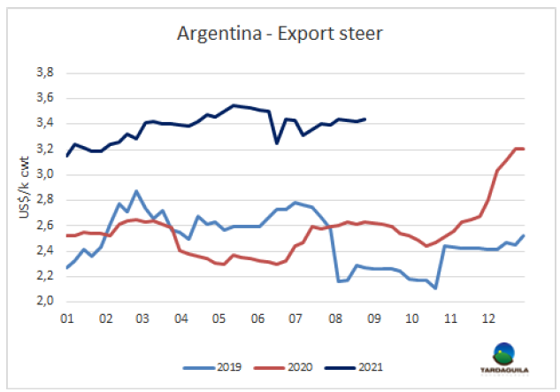 據(jù)阿根廷牛肉推廣局(IPCVA)基于國家統(tǒng)計和人口普查數(shù)據(jù)的一份報告,7月阿根廷牛肉出口量36113噸(相當(dāng)于約50600胴體重量),出口額約1.95億美元,不包括內(nèi)臟。7月出口量比6月下降了0.5%(這反過來表明出口庫存比5月暴跌了45%),出口量較2020年同期低33.4%。7月出口額較6月增長了22.6%,但與2020年7月相比同比下降15.2%。7月平均出口價格較上月上漲18%,較2020年7月上漲27.4%。上一個移動年阿根廷牛肉出口量達(dá)89萬噸。IPCVA表示,在上一個移動年(2020年8月至2021年7月),出口量接近89萬噸,出口額接近26.6億美元。僅在2021年前7個月,阿根廷牛肉出口量達(dá)到了334341噸,比去年同期增長近2%,其中76.6%出口到中國。今年前7個月阿根廷隊中國牛肉出口量增長了185%,而其他國家的牛肉出口量累計萎縮了85%。