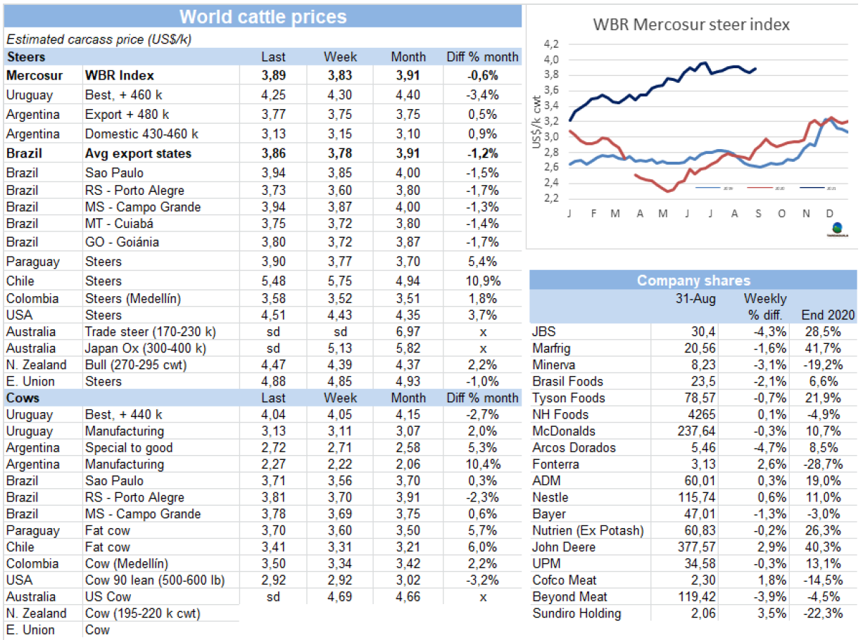 上周巴西雷亞爾增值逆轉(zhuǎn)了近幾周南美市場(chǎng)閹牛價(jià)格指數(shù)的下行趨勢(shì)。南方共同市場(chǎng)閹牛價(jià)格指數(shù)上漲6美分至3.89美元/公斤。該指數(shù)上漲的主要原因是雷亞爾增值4%。巴西主要出口州育肥牛價(jià)格上漲8美分至3.86美元/公斤,盡管本地牛價(jià)下跌了6雷亞爾/15公斤,自五月末14周以來首次跌破300雷亞爾/15公斤。巴拉圭方面的降雨使供應(yīng)端的壓力得到了緩解,最近兩周待宰牛價(jià)格上漲了20美分至3.9美元/公斤,巴拉圭牛價(jià)成為南美第二高。阿根廷出口閹牛價(jià)格上漲了2美分至3.77美元/公斤。烏拉圭牛價(jià)保持下降趨勢(shì),參考價(jià)4.25美元/噸。