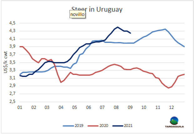 自8月初價(jià)格達(dá)歷史最高水平以來,育肥牛市場(chǎng)一直保持著溫和的下跌趨勢(shì)。一方面,有些人認(rèn)為供應(yīng)略有增多,另一方面,需求端非常關(guān)心是否可以找到集裝箱把已完成的產(chǎn)量運(yùn)走。有工廠稱未來幾天甚至幾周由于裝運(yùn)延誤可能將被迫減產(chǎn)。美麗華決定可能從下周中旬開始停止在3廠的生產(chǎn),并讓員工休假直到10月初。Marfrig還在評(píng)估暫停55廠的屠宰活動(dòng),可能在未來幾小時(shí)內(nèi)做出決定。目前的裝運(yùn)除了通過蒙得維的亞港以外,也在尋求其他港口,但這并不容易,南美地區(qū)乃至世界上所有港口都有同樣的問題。有些工廠預(yù)定了3-4周后的牛,但還沒有采購;還有一些工廠預(yù)定一周之內(nèi)交貨的牛,母牛的需求量大于閹牛。特種閹牛價(jià)格大多是每公斤4.25美元,有幾頭超過了4.20美元,偶爾也有4.3美元的交易。對(duì)于母牛來說,體重較重的一般支付4.00-4.05美元,體重較低的最高可達(dá)4.10美元。人們預(yù)計(jì),市場(chǎng)將繼續(xù)緩慢下滑,特別是在物流問題無法解決的情況下。育肥牛市場(chǎng)保持下行趨勢(shì),或?qū)⒊掷m(xù)數(shù)周。據(jù)被問詢的市場(chǎng)參與者反映,大多數(shù)工廠備貨充足,期貨采購時(shí)間拉長,有些工廠甚至開始買九月前10天的牛。這種情況下工廠壓價(jià)幾美分,只要生產(chǎn)者可以接受,價(jià)格會(huì)繼續(xù)下跌。本周用于出口的特種閹牛參考價(jià)4.3美元/公斤,國內(nèi)市場(chǎng)的閹牛參考價(jià)4.25美元/公斤,肉母牛4.05-4.15美元/公斤,牛供應(yīng)量仍很少,預(yù)計(jì)15天之后隨著天氣變化和烏拉圭南部的降雨來臨活牛供應(yīng)將增加。