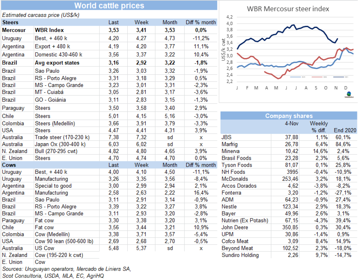 南方共同市場閹牛價格指數(shù)較上周上漲12美分至3.53美元/公斤。此次上漲最主要受巴西市場育肥牛平均價格急劇上漲的影響,而本周雷亞爾增值了3.6%,因此巴西主要出口州育肥牛平均價格上漲了24美分至3.16美元/公斤。阿根廷市場含9%出口稅的出口閹牛的價格穩(wěn)定在4.2美元/公斤;烏拉圭牛價水平與阿根廷相當(dāng)。巴拉圭方面牛價漲勢短暫,本周有10美分的下行調(diào)整,達(dá)3.5美元/公斤。
