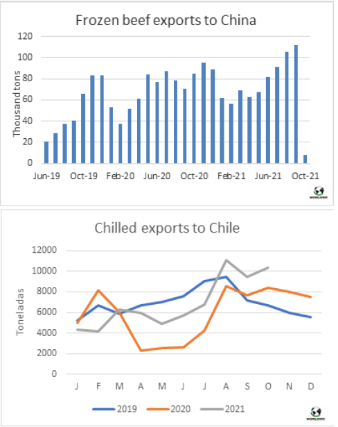 烏拉圭和該地區(qū)其他國家10月份的牛價差異很大,導(dǎo)致牛肉進(jìn)口量每月增加700多噸,主要是后部位肉。根據(jù)海關(guān)數(shù)據(jù),2909噸新鮮牛肉進(jìn)入該國,其中2765噸是冰鮮牛肉。十月冰鮮牛肉的平均價格為4974美元/噸,略高于九月1.5%。這是因為后部位肉進(jìn)口量在總進(jìn)口量中占比大大增加,從9月的1303噸增至10月的2088噸,而前部位肉的采購量仍維持在670噸左右。巴西是冰鮮牛肉的主要進(jìn)口來源國,其中91%的進(jìn)口冰鮮牛肉來自巴西,其余的來自巴拉圭。10月進(jìn)口量最大的公司是Abasto de Carnes Saturno(511噸),其次是Santa Clara(475噸)和Maufe(381噸)。截至今年10月,烏拉圭累計牛肉進(jìn)口量21647噸,比2020年同期減少了21%。