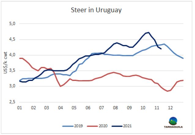 烏拉圭育肥牛市場受工會活動影響中斷,周一至周二,活牛采購商和中間機構(gòu)重新制定周一到周二本應(yīng)屠宰的牛的數(shù)量計劃,因此強勢的價格上漲被打斷。供應(yīng)端在上周的降雨之前就受到限制。市場參考價保持上周周中水平,閹牛成交價4.15-4.2美元/噸,母牛成交價3.9-4美元/噸,45天付款。預(yù)計工會問題得到解決后,市場將在目前的價格水平形成大規(guī)模成交。