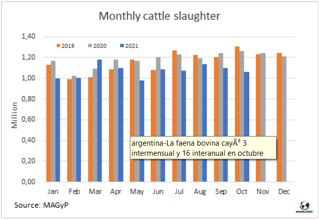 10月牛屠宰量106萬頭,是今年屠宰量最低的月份之一,僅超過了1月、2月和5月的屠宰量,1月和2月是夏季月份,5月出口暫停,禁止出口,農(nóng)民為了抗議而停止銷售活牛。10月屠宰量較上月下降了3.2%,與2020年同期相比下降了15.7%。在2019年和2020年,10月都是一年中最繁忙的月份。截至2021年10月,阿根廷共屠宰了1070萬頭牛,比2020年同期減少9%。