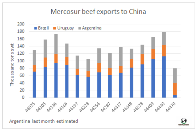 10月南美市場對中國牛肉出口量下降了約10萬噸