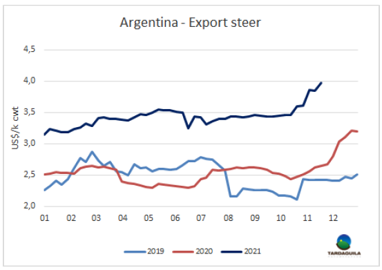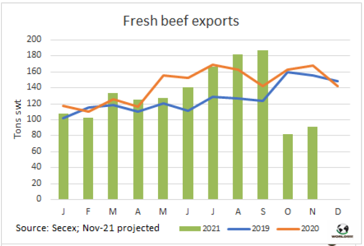 上周希爾頓臀肉出口價(jià)格急劇下跌,一系列因素給市場帶來不確定性。首先是歐洲市場對第四波疫情采取了新的管控,德國和荷蘭宣布了新的防疫限制措施,奧地利則選擇控制未接種疫苗的人口(超過30%),以遏制疫情的傳播。上周歐元走軟,人們猜測明年1月1日開放的下一個(gè)季度配額窗口會(huì)有大量481配額的牛肉進(jìn)入。盡管阿根廷方面的報(bào)盤有限,成交價(jià)達(dá)13300-13800美元/噸離岸價(jià)。最近幾天由于工會(huì)罷工屠宰活動(dòng)減少了很多。