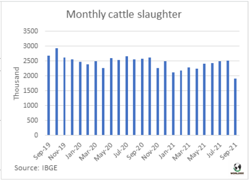 巴西地理統(tǒng)計(jì)研究所(IBGE)的調(diào)查顯示,2021年第三季度,巴西衛(wèi)生檢疫機(jī)構(gòu)注冊的屠宰場牛屠宰量達(dá)691萬頭。與2020年第三季度相比下降了11.1%,與2021年第二季度相比下降了2.4%。屠宰量的下降主要發(fā)生在9月份,當(dāng)時(shí)對中國的出口暫停,導(dǎo)致出口工廠的需求急劇下降。當(dāng)月牛屠宰量191萬頭,是自2004年3月(17年前)以來的最低月屠宰量。2021年第三季度牛肉產(chǎn)量(胴體重量)188萬噸,較2020年同季度下降了9.4%,較今年第二季度下降了0.4%,平均胴體重量的增長部分抵消了屠宰量的下降。今年第三季度待宰牛均重272公斤,較去年同期增長了5.2公斤。