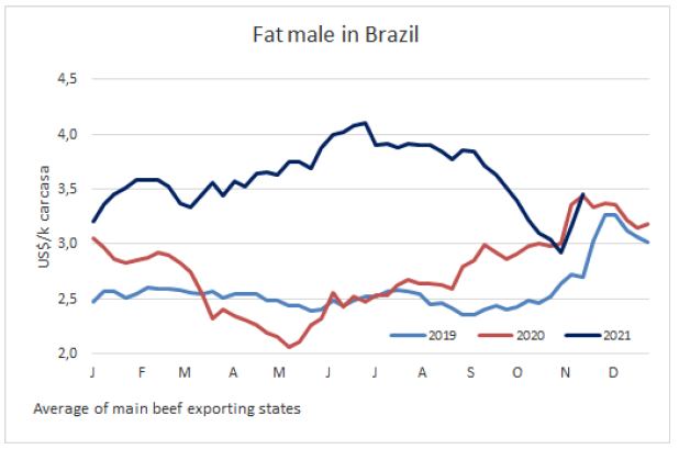 受11月前半月國內(nèi)市場銷售樂觀拉動(dòng),上周牛價(jià)急劇上漲。所有農(nóng)貿(mào)市場價(jià)格均有回漲,漲勢不均,圣保羅、米納斯吉拉斯、南馬托格羅索州的牛價(jià)一周內(nèi)上漲了10%-12%,馬托格羅索、隆多尼亞等地區(qū)牛價(jià)漲幅約6%-7%。圣保羅州活牛成交價(jià)300雷亞爾/15公斤, 9月中旬以后活牛成交價(jià)就從這一水平下滑。價(jià)格的回漲原因有供應(yīng)和需求兩個(gè)方面。11月1日,巴西國內(nèi)需求持續(xù)回升,導(dǎo)致牛肉批發(fā)價(jià)格上漲7-8%。相反,活牛供應(yīng)不充足,主要是因?yàn)橛蕡龃笠?guī)模出欄的時(shí)期已經(jīng)過去。期貨市場牛價(jià)格有大幅上漲,2022年1月交貨的牛參考價(jià)超過320雷亞爾/15公斤,高于中國市場暫停以前的活牛市場價(jià)格。