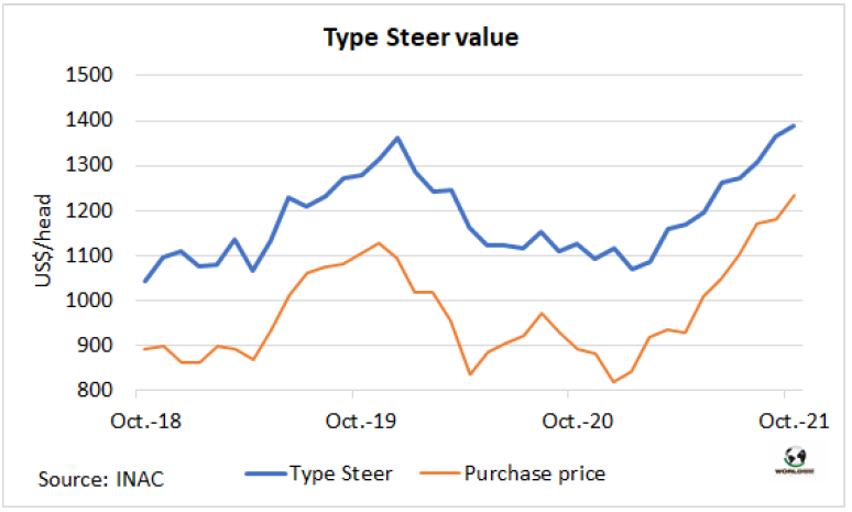 閹牛類型價(jià)值,是對牛肉工廠出售牛分割出的所有產(chǎn)品價(jià)格的加權(quán)估算,10月閹牛類型價(jià)值達(dá)歷史新高。據(jù)INAC的報(bào)告,閹牛類型價(jià)值平均1389美元,比9月增加了22美元,比去年同期增加了261美元(23%)。INAC稱這是因?yàn)椤俺隹诓课蝗夂蛧鴥?nèi)市場胴體價(jià)格的上漲”。相反,鮮皮、內(nèi)臟和副產(chǎn)品價(jià)值下降。相反,10月活牛采購價(jià)上漲了53美元/頭至1233美元/頭。活牛采購價(jià)與閹牛類型價(jià)值之間的差額(INAC稱之為工業(yè)增加值)本月減少了31美元至156美元,僅為閹牛類型價(jià)值的11.2%。