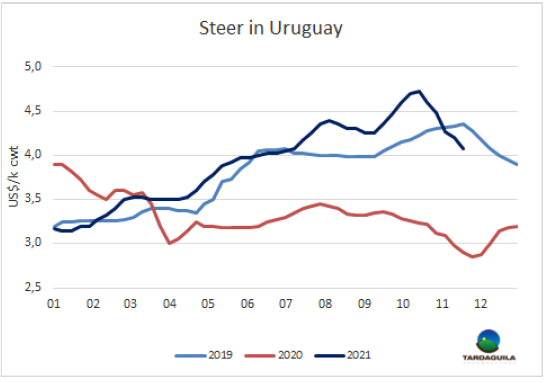 上周出口閹牛和價(jià)格上漲了15比索/公斤,英國純種閹牛參考價(jià)390-400比索/公斤,澤布雜交牛價(jià)參考價(jià)380-390美元/公斤,母牛價(jià)格上漲了5比索至320-330比索/公斤,工業(yè)母牛參考價(jià)保持275-285比索/公斤。每月3500噸猶太潔食部位肉加上希爾頓屠宰部位肉更好地融合在一起,產(chǎn)生了更大的出口需求,此外5000噸對中國出口的工業(yè)母牛產(chǎn)品加上育肥場的財(cái)政困難導(dǎo)致牲畜短缺是過去一個(gè)半月出口牛價(jià)格急劇上漲的主要原因。10月起,閹牛的比索價(jià)格價(jià)格累計(jì)上漲了16%-17%,特優(yōu)母牛價(jià)格上漲了18%,工業(yè)母牛價(jià)格上漲了13.5%。一個(gè)半月內(nèi)通脹率5%,所有用于屠宰的牛種類實(shí)際價(jià)值均有上漲。