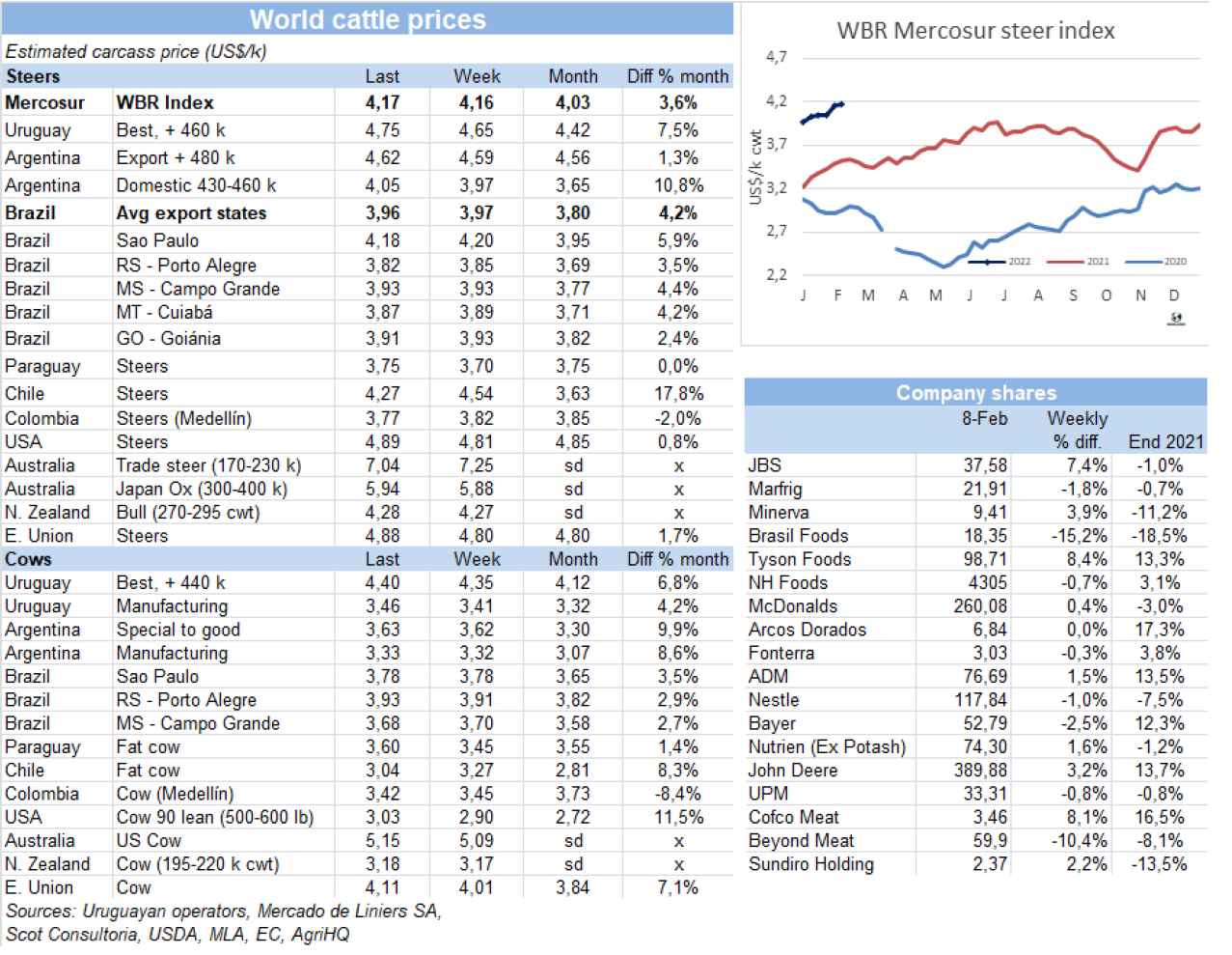 本周南方共同市場閹牛價格指數上漲了1美分至4.17美元/公斤。不同國家參考價均保持穩(wěn)定,盡管巴西方面育肥牛價格有輕微下調,下跌了1美分至3.96美元/公斤。其他三個國家牛家均為上漲趨勢,烏拉圭牛價目前是南美最高,本周上漲了10美分,達4.75美元/公斤的新紀錄。阿根廷出口閹牛價格上漲3美分至4.62美元/公斤,含出口稅。巴拉圭方面供應減少,待宰公牛價格上漲了5美分至3.75美元/公斤。