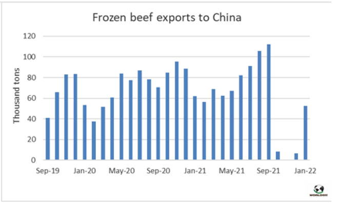 盡管低于去年出口量,但12月15日巴西牛肉重新開放后,1月中國再次成為巴西牛肉的主要出口目的地。根據巴西對外貿易部的數據,巴西對中國銷售總量為52583噸,盡管比2021年1月低15%,但中國仍然是巴西牛肉的主要買家。中國的復蘇并沒有阻止其他目的地的采購量增加,比如埃及和美國。埃及采購量同比增加了5倍,美國采購量同比增加了11倍,分別成為當月冷凍牛肉的第二和第三大出口目的地。
